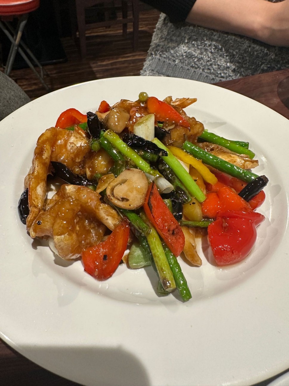 沢山のお野菜と一緒に炒められた揚げた車海老が旨い。唐辛子はあまり辛く無い種類ですが良いアクセントになってました