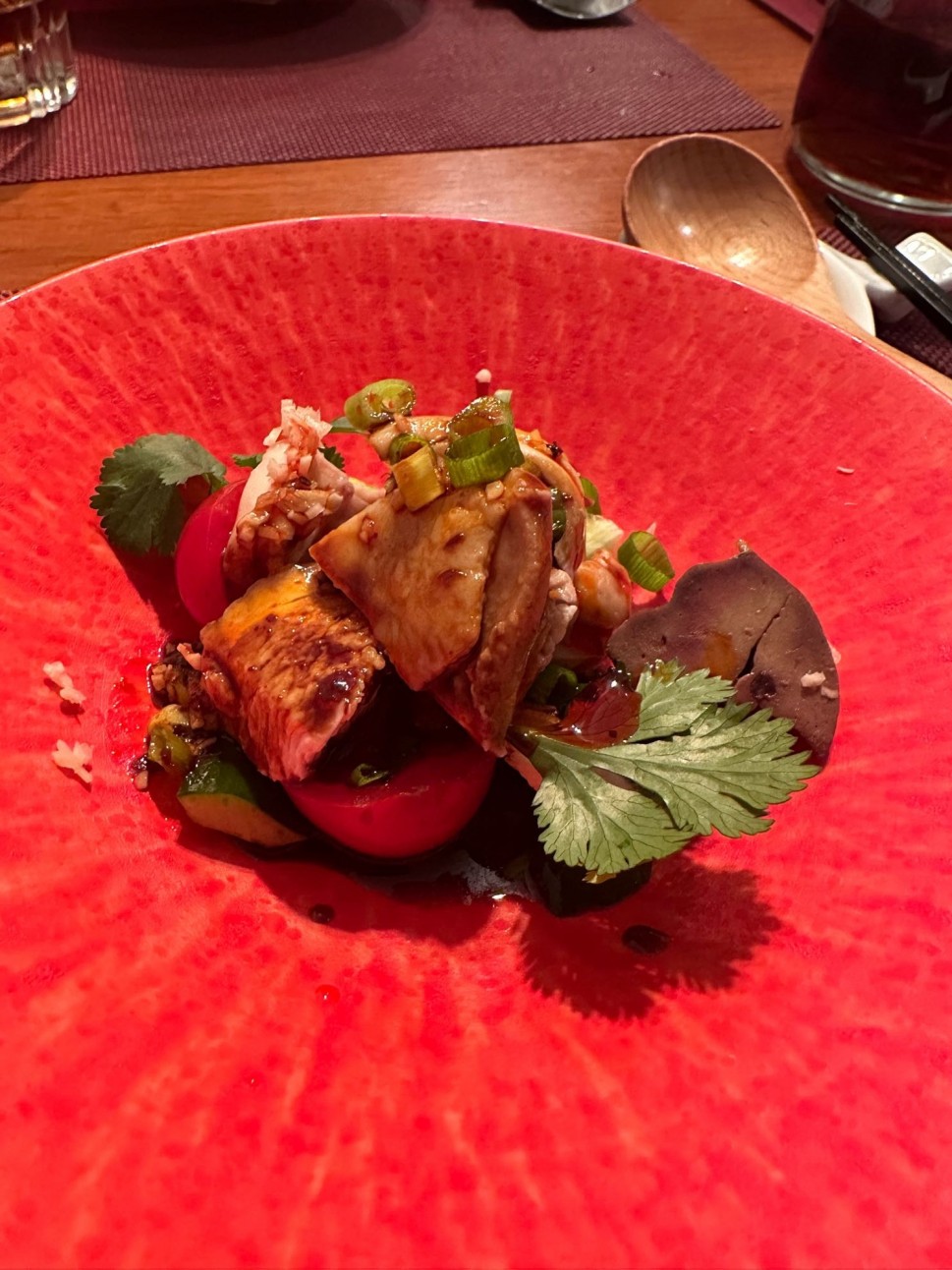夜のおまかせのよだれ鶏。見た目はよく知るものとは違い、しかも鶏レバーが含まれています。八角の香りも絶妙で記憶に残る一品でした。辛さは控えめですが満足の一品です