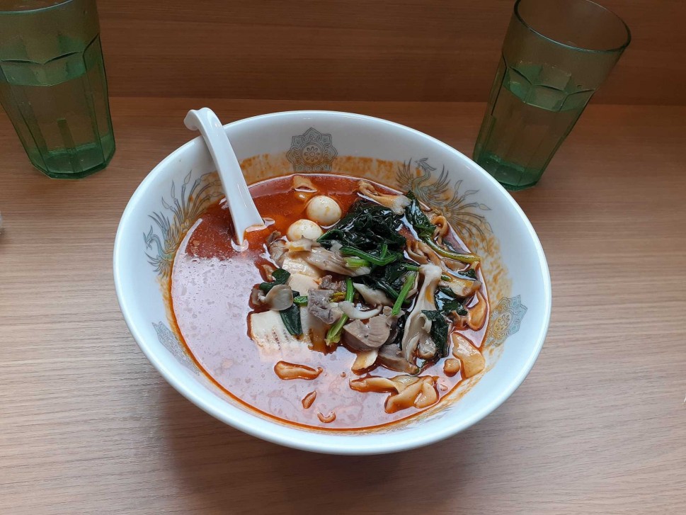 麺(刀削麺、ラーメン、春雨、板春雨、麺なし)と、スープ(辛さ7段階)と、トッピング5種(魚介、肉から、野菜)を選んで注文