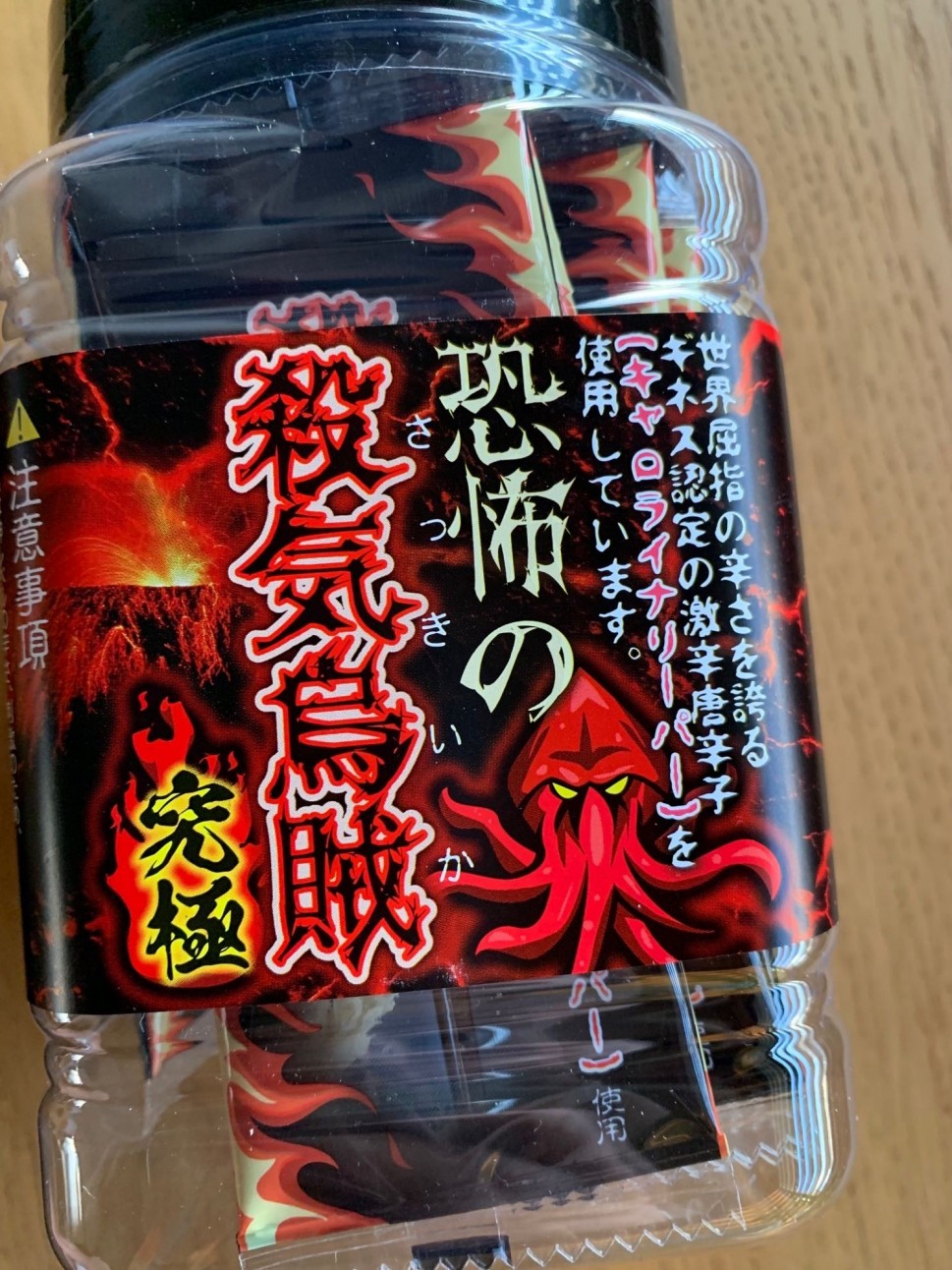 プラの入れ物の中に袋小分けになってます。なるほど。もし一気に食べたら悶絶できる辛さ。何故か喉にもきます。見た目は普通の裂きイカだけに危ない代物。名に偽り無しですね。
