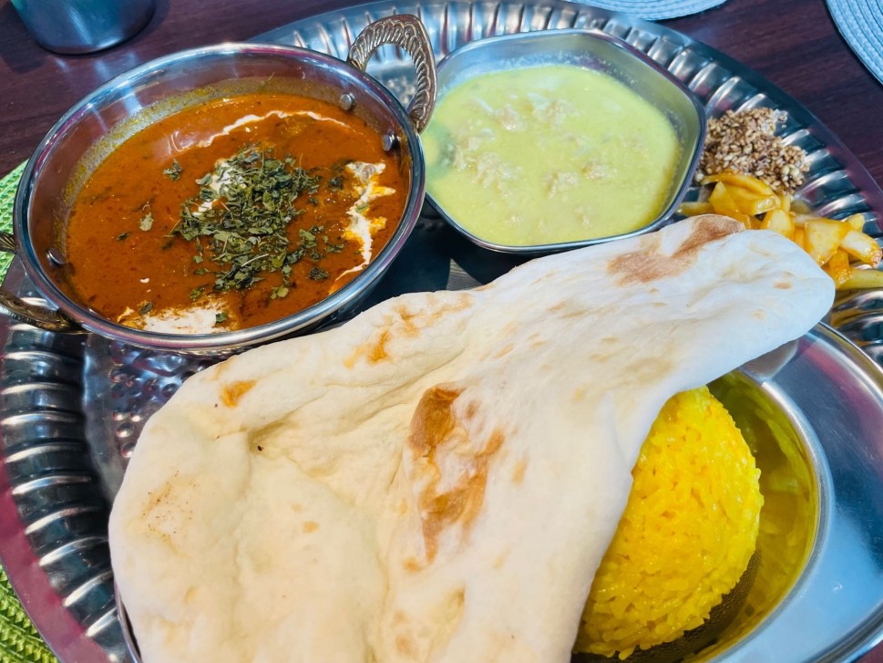 ナンとライスとカレーと欲張れるランチ。気づいたときには完食。卓上のスパイスは少量でも辛くなるので味を邪魔せず調整可能。