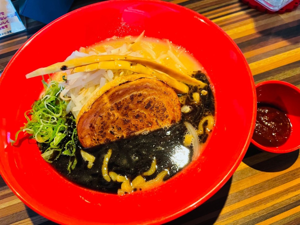 トッピングに激辛ベースを(黒とんそば自体は辛くない)合成のような赤い器にスタイリッシュな筍。底から卵が出てくるサプライズがあるので初見のリアクションを推奨します。
