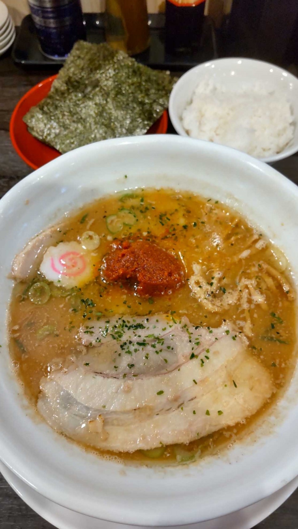 からみそラーメン6辛食べました。魚介系の濃厚なスープに辛みそを溶かして食べます。