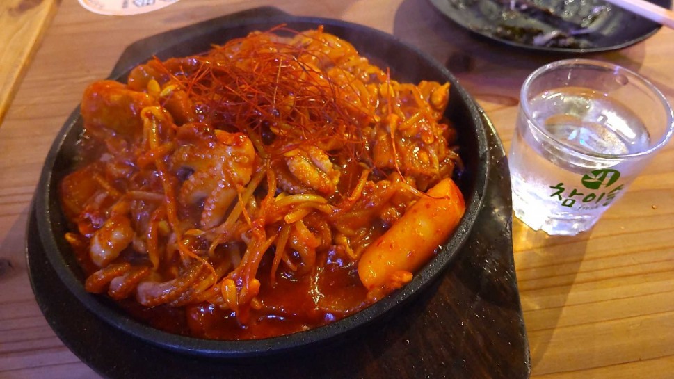 豆もやしとタコと豚肉の炒めです。大辛の上に激辛があり、激辛頼んだらすごい辛いからと止められ、大辛でオーダー。