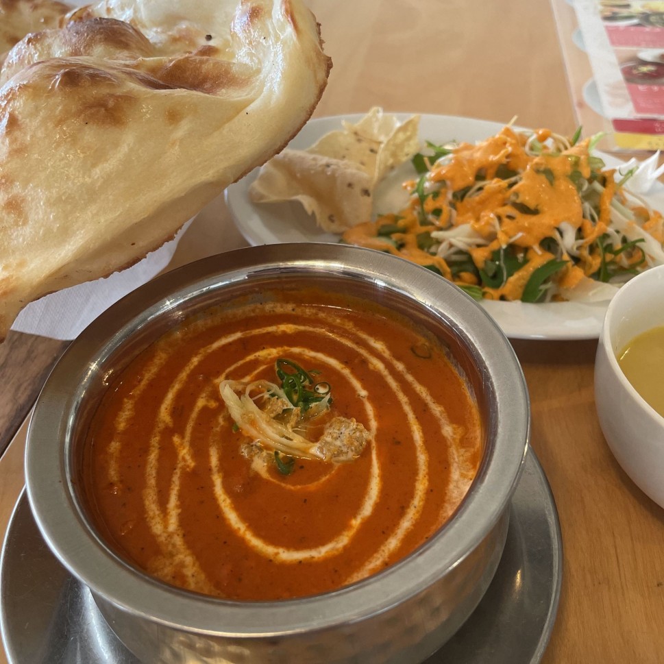 辛さは5段階、一番上の激辛をチョイスカレーも(チキン・キーマ・野菜)から選ぶ仕様+サラダ+スープコクもスパイスも効いた激辛の見た目通りでナンも美味い😋久しぶりの当たりカレー屋🥹