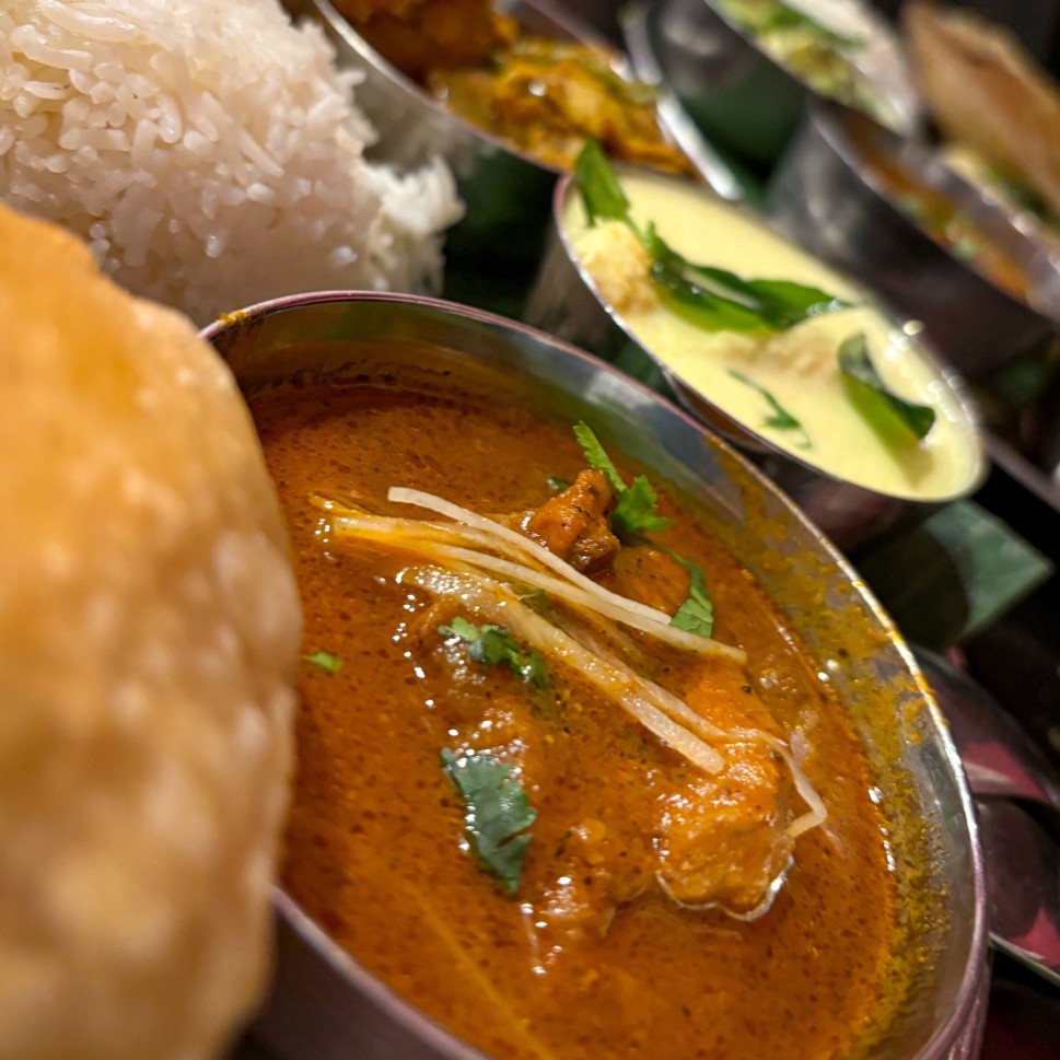チキンカレーと白身魚のカレーとサンバル、海老のポリヤルにラッサムスープ、バスマティライスにパパドにプーリ…