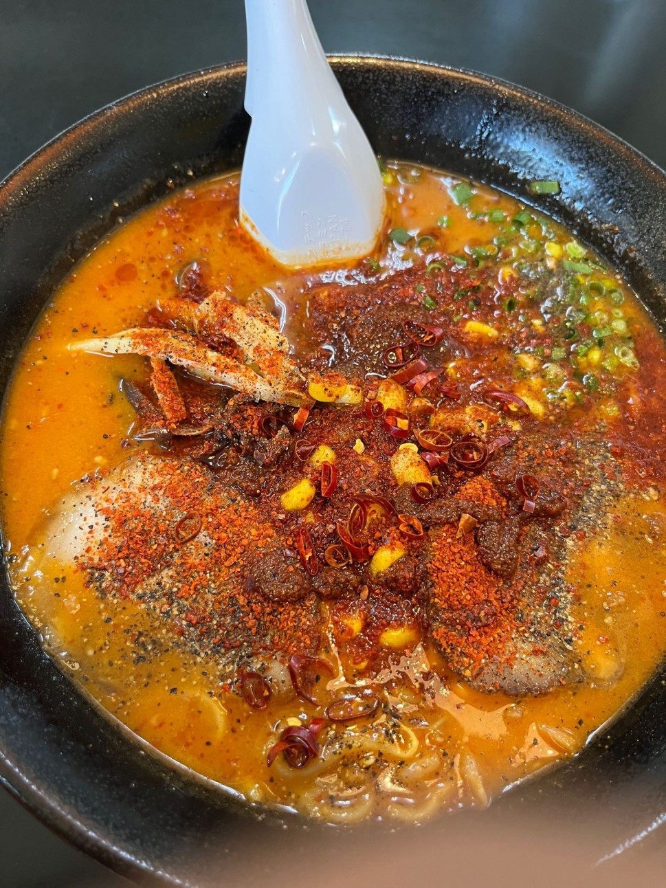 見た目ほど辛くはなく、サッと頂けます。普通の味噌ラーメンに唐辛子と胡椒マシマシにした感じです!が、スープの熱さと天気の良さ(歩いて行ったため)も相まって汗だくです💦麺は味噌には珍しく細麺🍜ここの所、下っ腹が気になるのでスープは残しました〜🤪