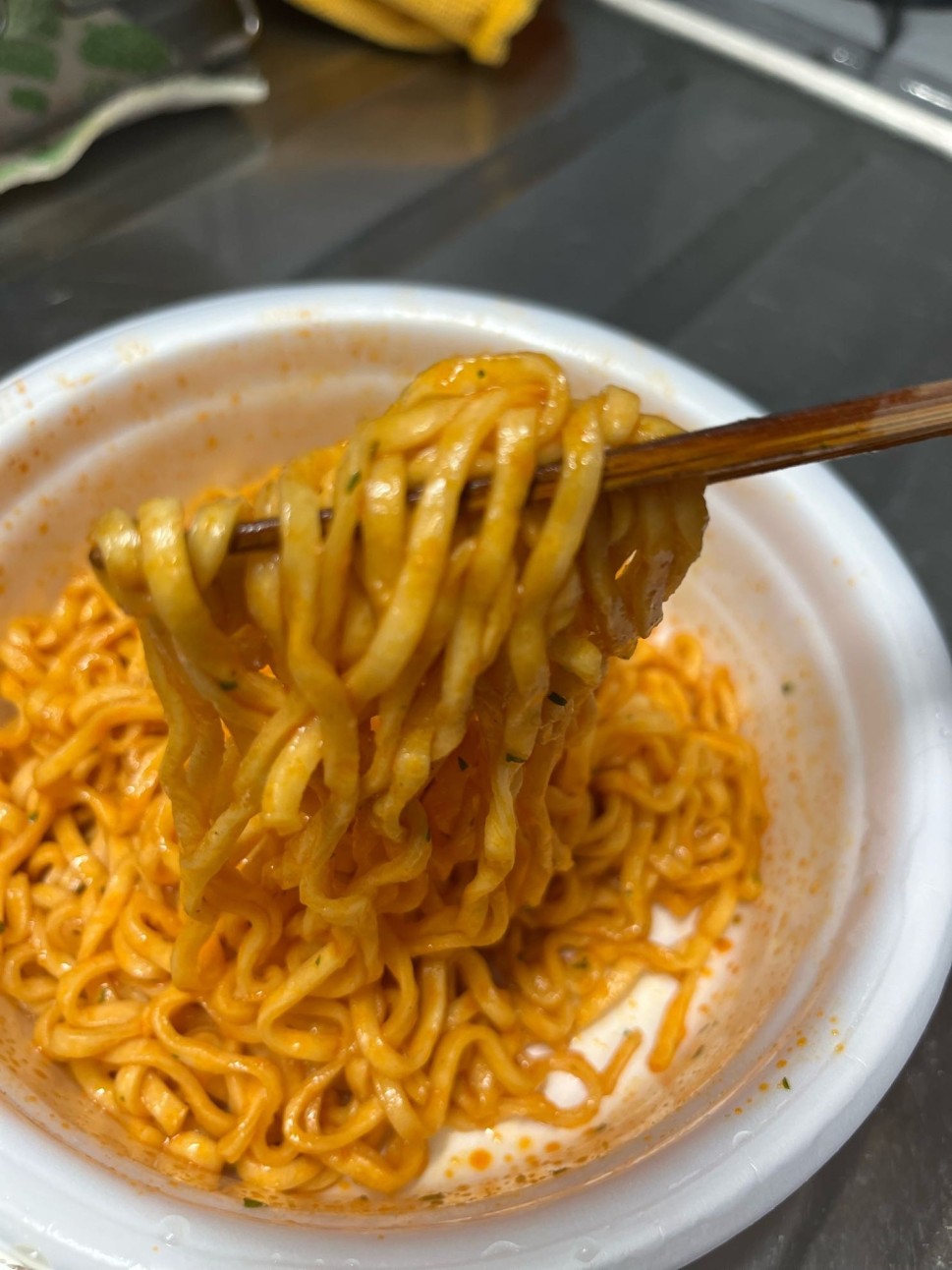 だいぶ、甘く感じる。プルダックのカルボの方が私は好み🌶激辛好き出ない家族は「こっちなら美味しく食べられる」とのこと😌