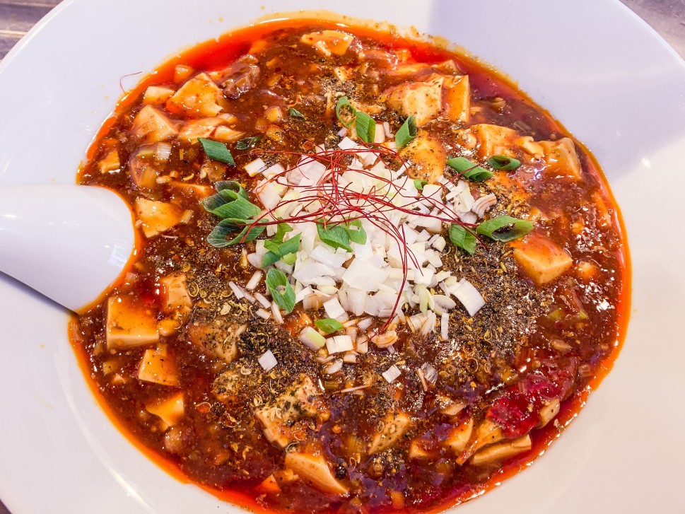 ラーメンに麻婆豆腐をトッピングしたのではなく、汁(?)全体が麻婆豆腐で、麺を麻婆豆腐に絡めて食べる感じなのが嬉しい。