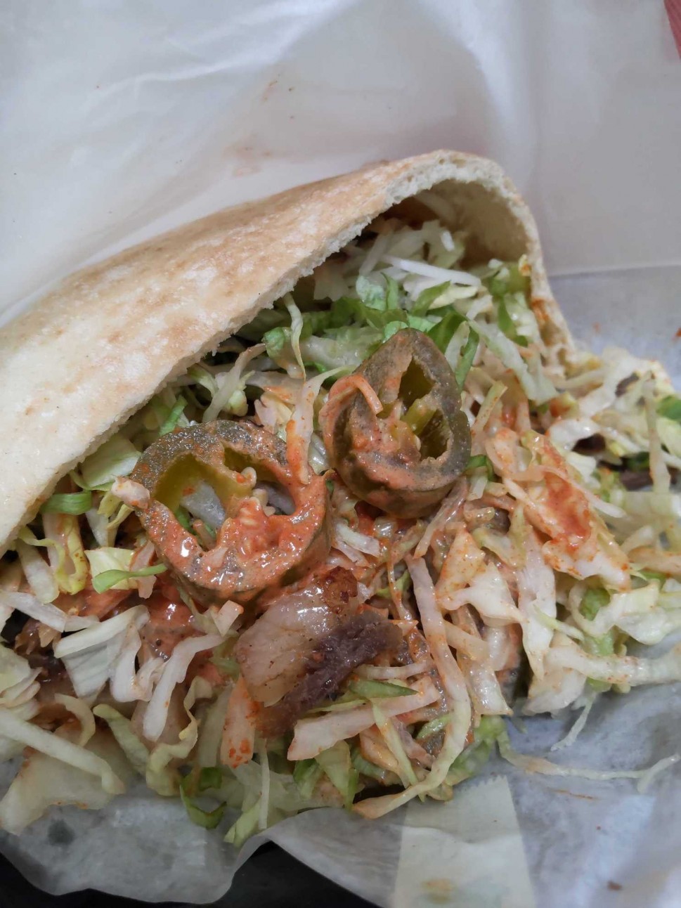 食べ始めから最後までたっぷり詰まっている濃厚ビーフと、フレッシュな野菜とまったりとした辛口ソースが絡み合って大変美味しいケバブサンドです❗️🐂※量大盛り+100円にしました