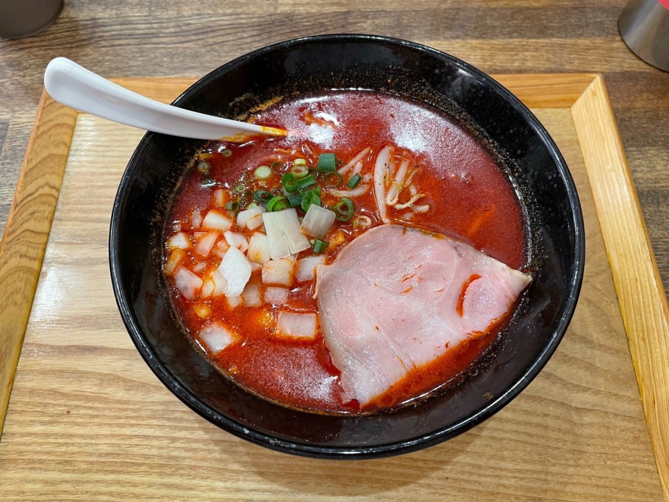 真っ赤なビジュアルにビックリしますが、底から麺を引き上げるとすりごまや鶏だしのクリーミーなスープが混ざってもう少しマイルドな見た目になります!