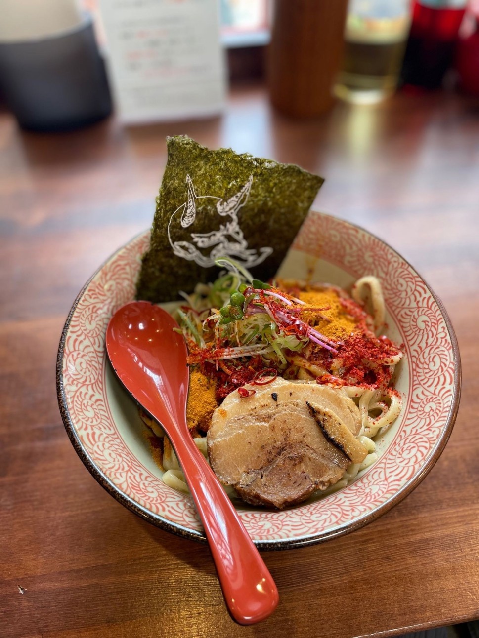 もっちもちの太麺が麻辣油や唐辛子と絡んでピリ辛で美味🐰分厚いチャーシューも美味しかった〜!!