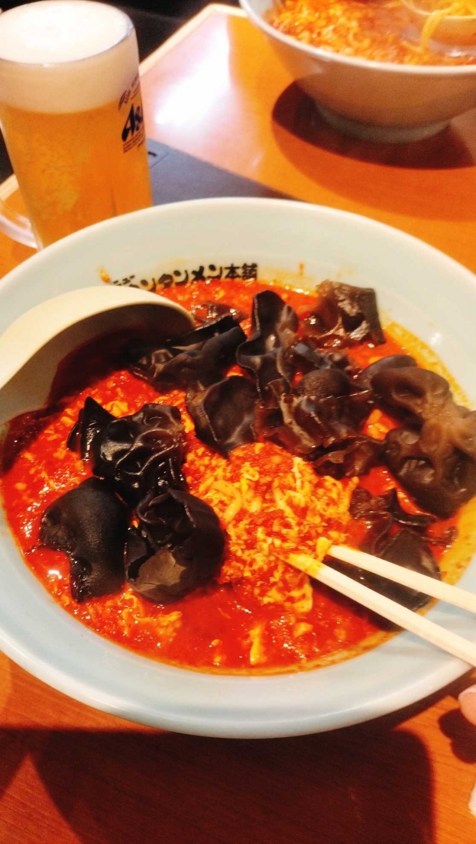 大好きなキクラゲトッピング!大きくて歯ごたえも◎ふわふわ卵とニンニクが食欲をそそります!壁のポスターに貼ってあった「鬼辛」。辛さは強くないですがニンニクのパンチでビールとも合います 笑