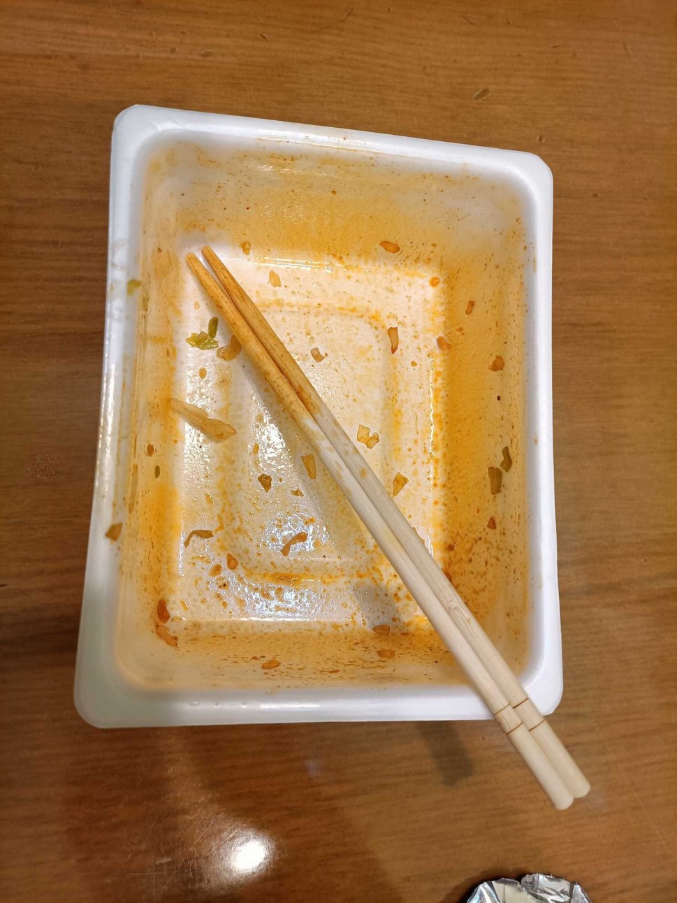 写真を取り忘れて完食の写真しか無いです。匂いはあんまり辛くなさそうと思い余裕じゃね?と思い4口目まではすぐ食べれたけど、そっから口の中が急に熱くなって手を止めてしまいました。流石にやばいと思い牛乳を使い口の中を一旦リセットしてまた食べ始めそこからノンストップで食べきりました。味はあんまり覚えてないです。