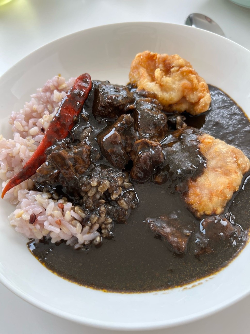 牛すじの甘み、旨味が美味しい!香辛料が効きすぎてなくイカ墨も主張しすぎてないのがいい。辛さも指すような暴力的に目立つようなものでなく、じわじわとくる。