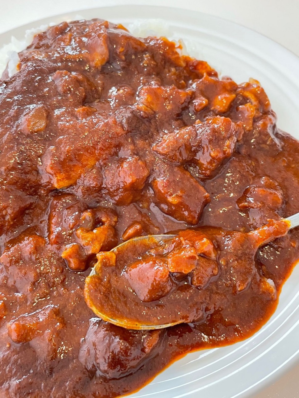 これは美味しいっ😆‼️好き❗️肉が多い、甘い、辛い、爽やか、ずっと甘い香り、そしてしっかり後まで辛い。これは私リピートですね。人にも勧めたくなる。すごいなこんな美味しいカレーに辛メーターが載ってて幸せ😍