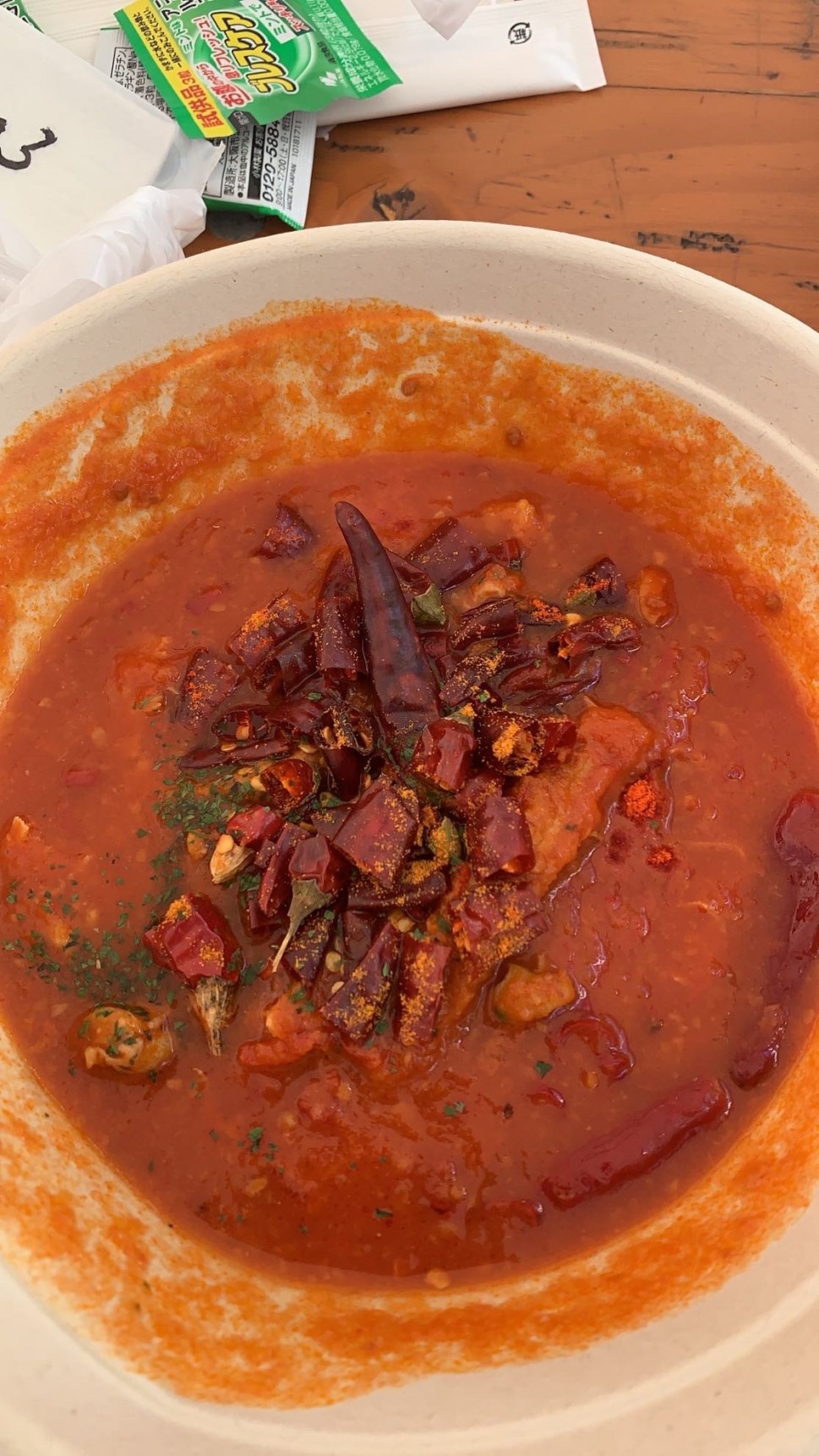 唐辛子は割と多く入っていたのですが見た目程ではなく、バリバリ食べても何の刺激もなく〜、自前のスコーピオンソースで追いスパイスしてました(^^;)激辛好きな方には物足りないかも知れません。
