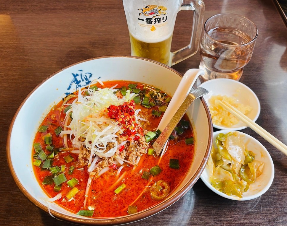 赤いスープと一番搾りが美味しそう😋 ザーサイ・ニンニク取り放題はステキですね👍