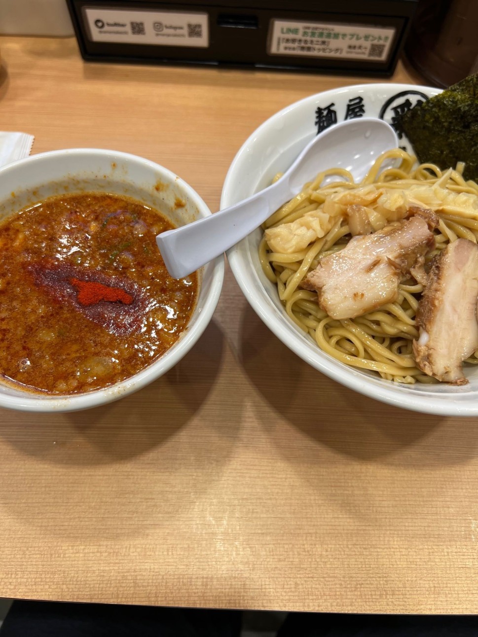 濃厚でうまいつけ麺。辛味はそこまで強くないですが、辛味パウダーがついているので追い辛で自分の好みまで辛くすることができます。濃厚なのでかなり追い辛してもうまい。来訪のたびにパウダーのかける量が増していくw