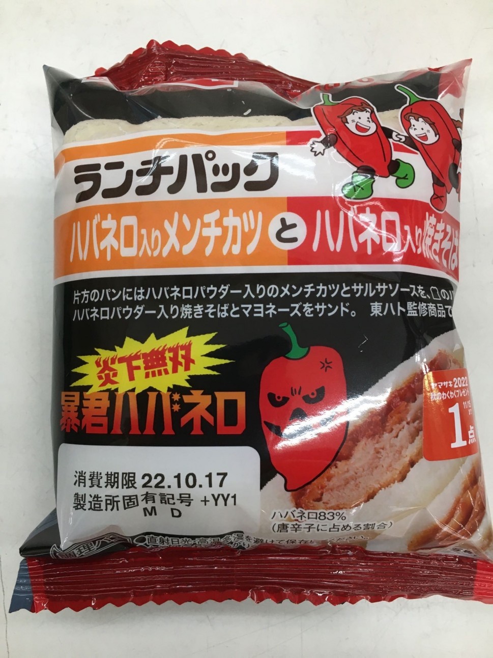 片方のパンにはハバネロパウダー入りのメンチカツとサルサソースを、食パンマークのパンにはハバネロパウダー入り焼きそばとマヨネーズをサンド。東ハト監修商品