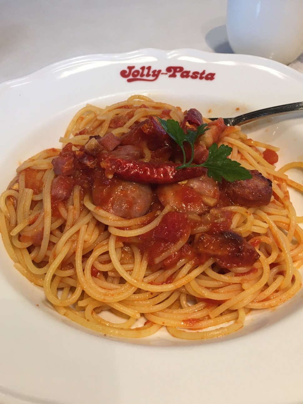 ソーセージの輪切りとベーコンの2種類のお肉が入っていてトマトソースがしっかり香る良い味のアラビアータ!
