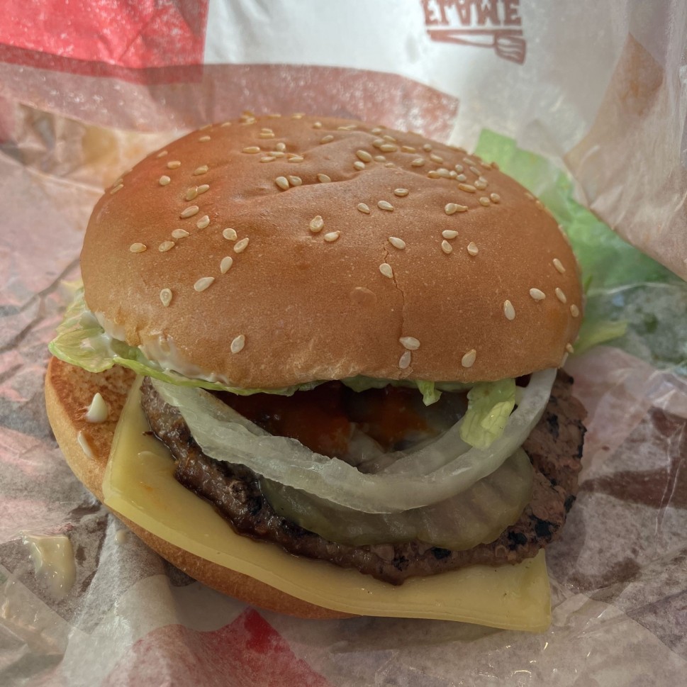 オニオン、トマトスライスの中にトマトホットソース共にいる炭焼きビーフパティ!