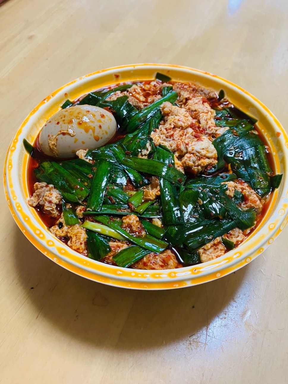 (^∇^)たっぷりのニラ玉を坦々麺にオンしている一品!