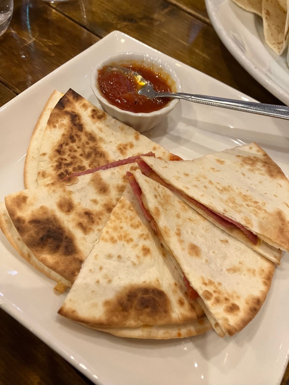 楽Qooさんのハムとチーズのケサデイーヤ!サルサソースでいただきます!