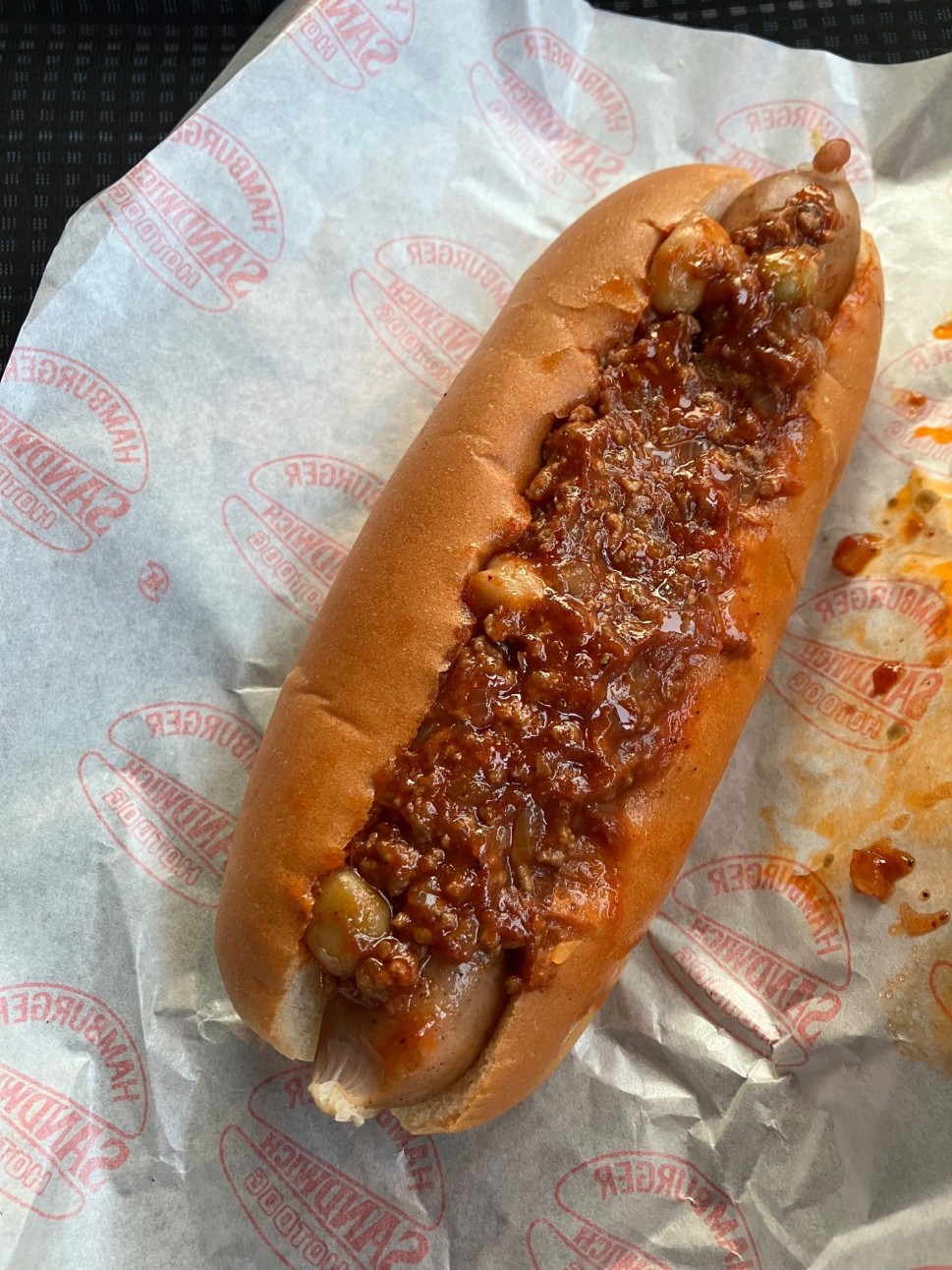 大きなソーセージとたっぷりとビーンズが入ったチリミート!