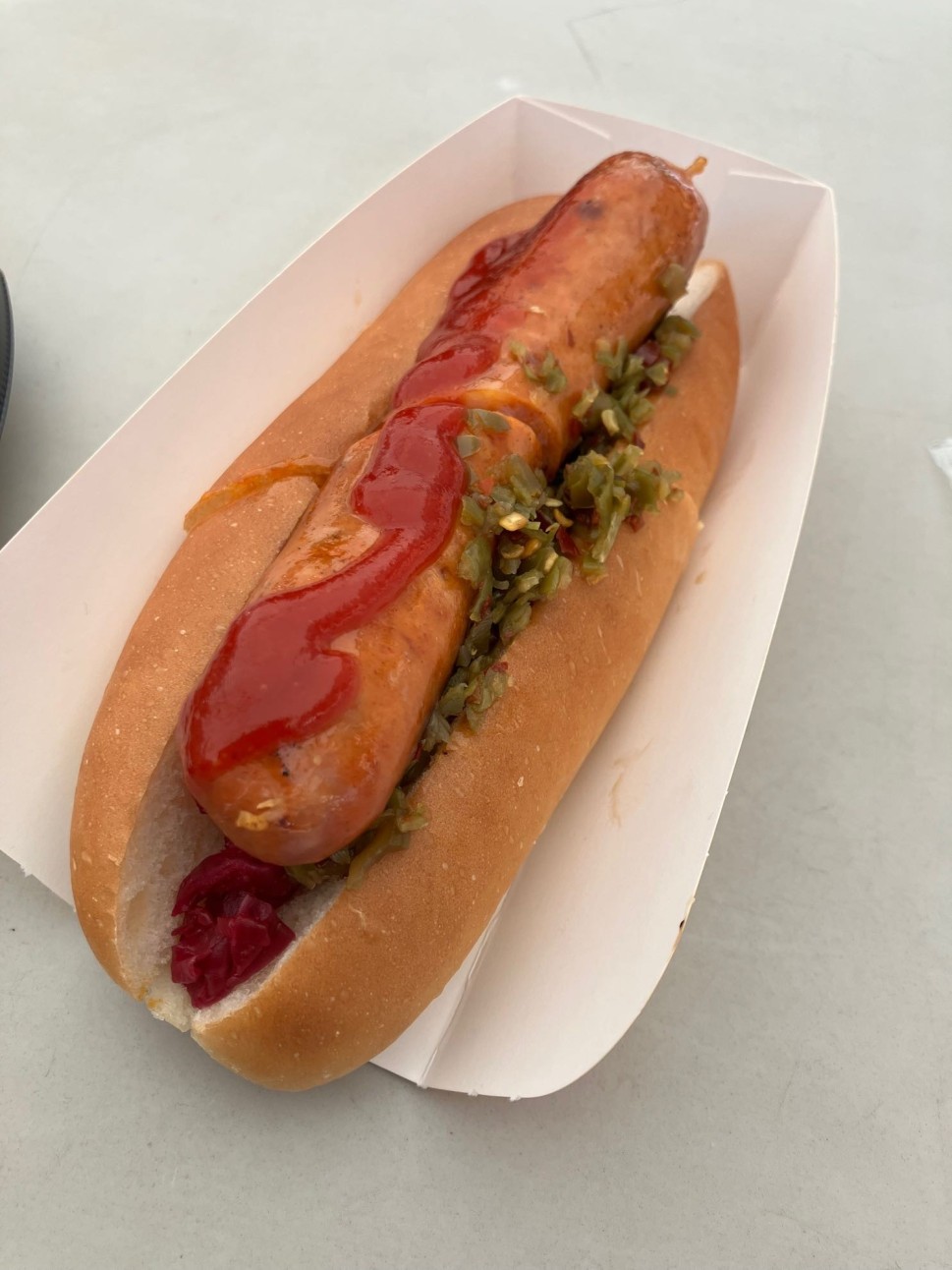 すごいボリュームのホットドッグ!ハラペーニョがこれでもかと盛ってあります!