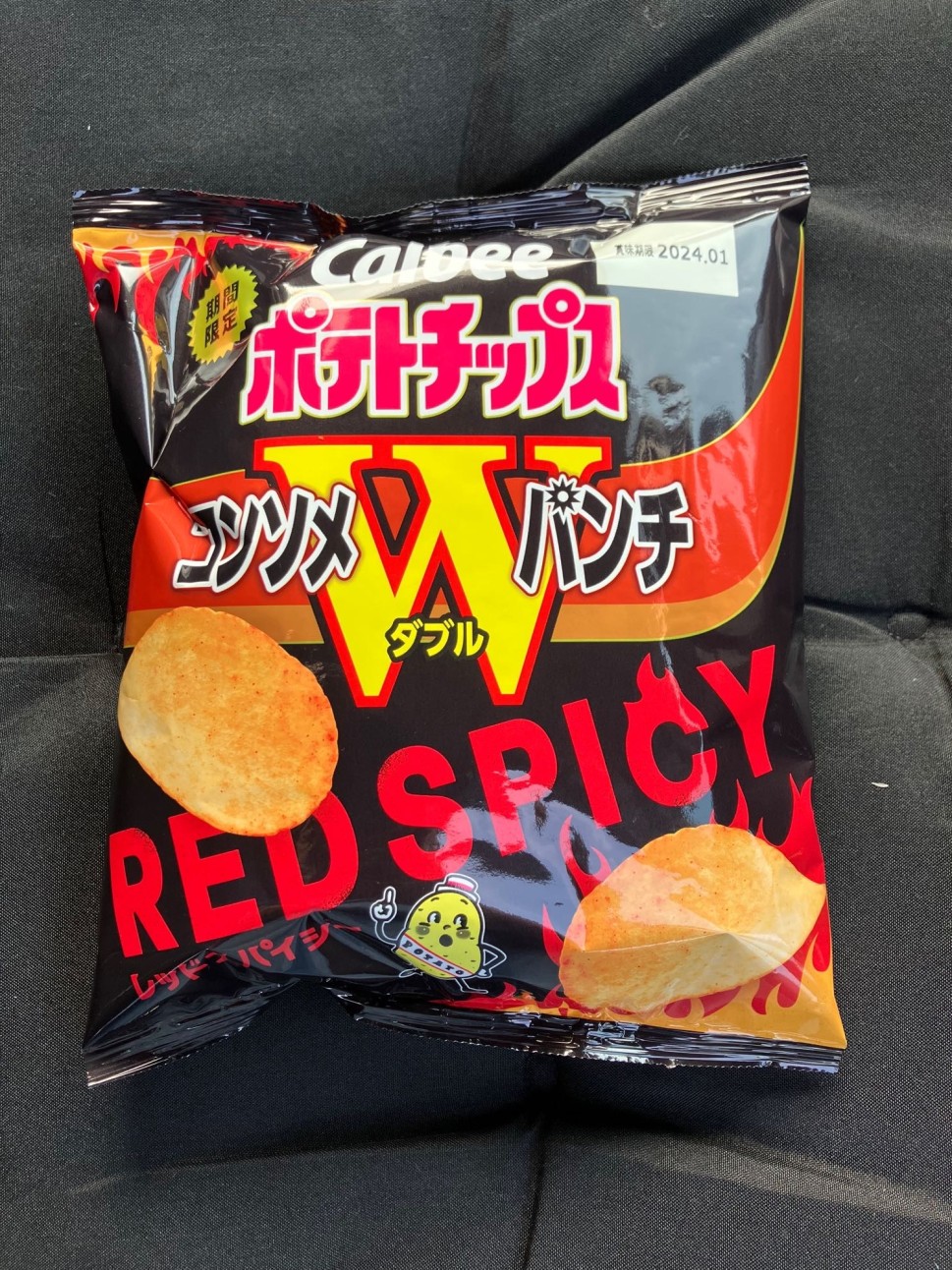 カルビー株式会社さんのポテトチップスコンソメWパンチレッドスパイシー!一枚目からバンっと表に来る辛さ!その後旨味!ほんのり辛みの余韻〜!