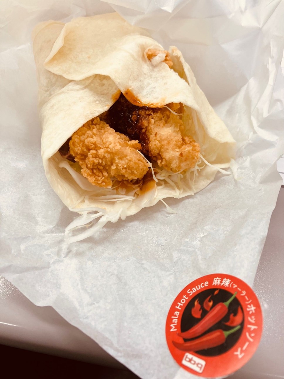 bbqオリーブチキンカフェさんの麻辣ラップサンド!一口目から辛み!