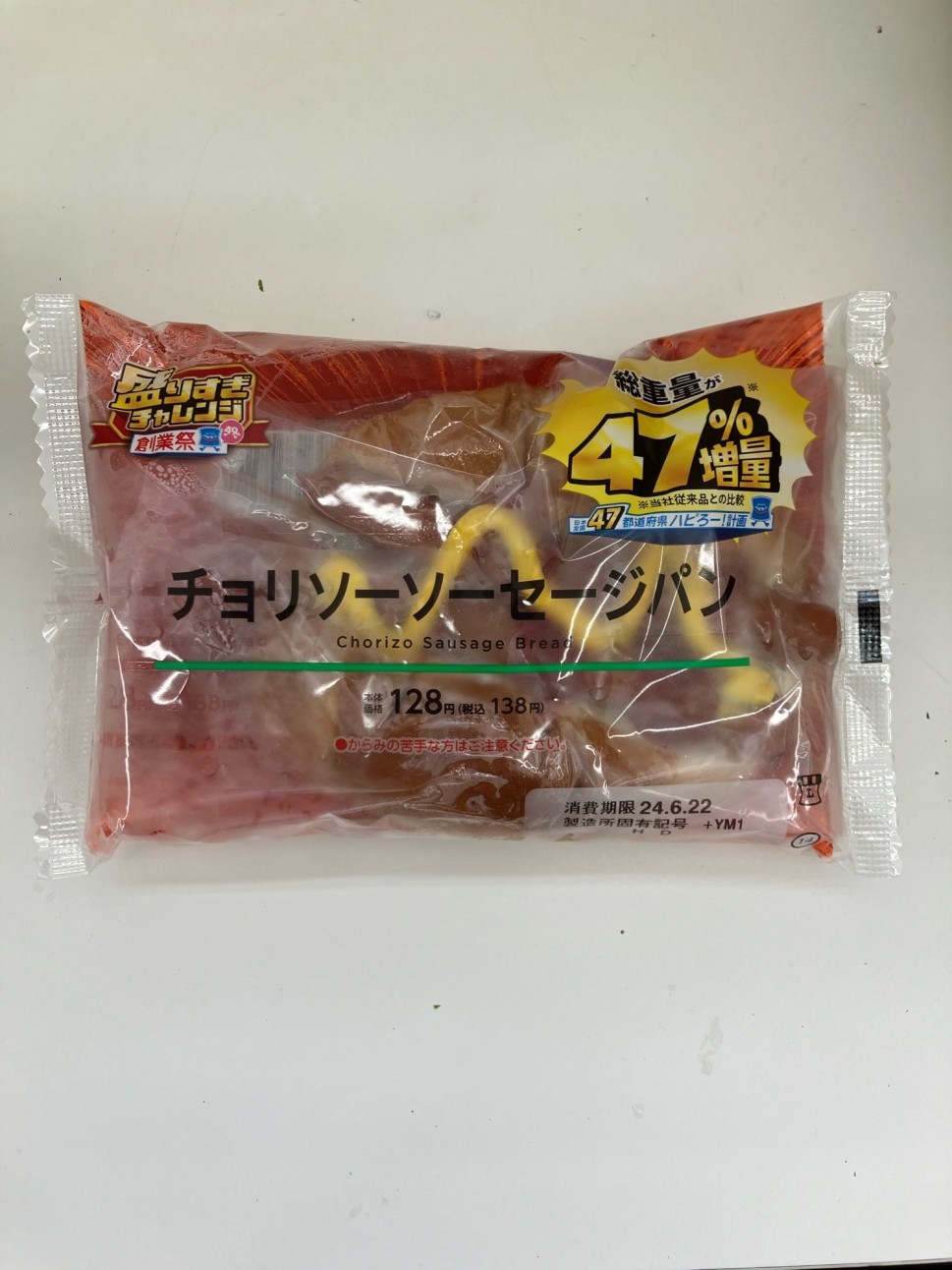 ローソンさんの総容量が47%増量 チョリソーソーセージパン!期間限定商品。従来あったチョリソーソーセージパンのソーセージが2本に増えた一品です!