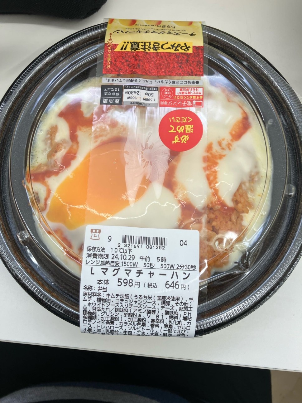 ローソンさんのやみつき注意! チーズマグマチャーハン!唐辛子を使用!辛みにご注意と書かれた一品!