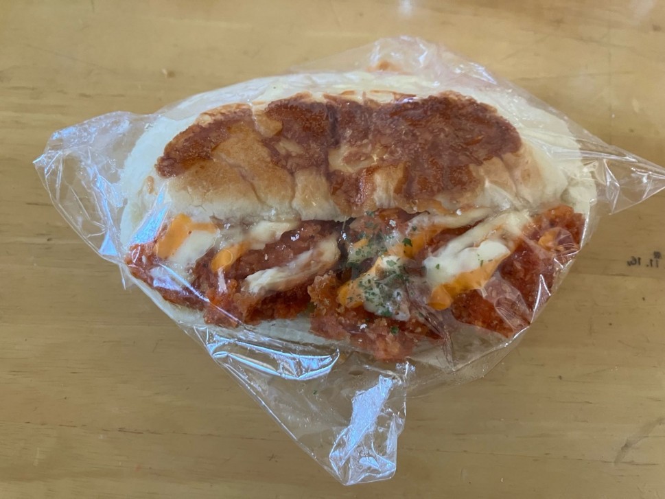 デイリーヤマザキさんのスパイシーチキン&チェダーチーズサンド!ピリ辛のスパイシーチキンが挟んである一品です。