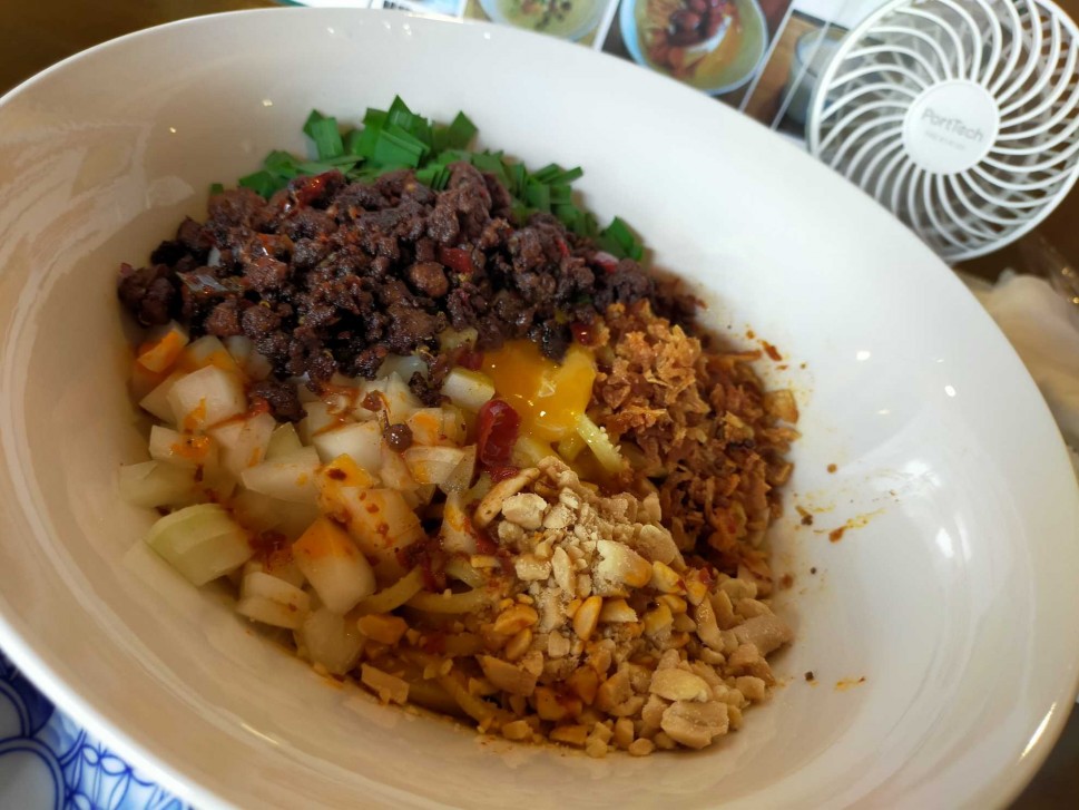 近くのたかの湯監修の夏限定辛まぜそば🌶辛みはさほど感じないけど花椒のシビレはとてもきいてる!ニラや刻みたまねぎ、ナッツやひき肉など具沢山で食べてて楽しくなるまぜそば😋🎶ガッツリ派の方は追いライスするといいです🍚🎶