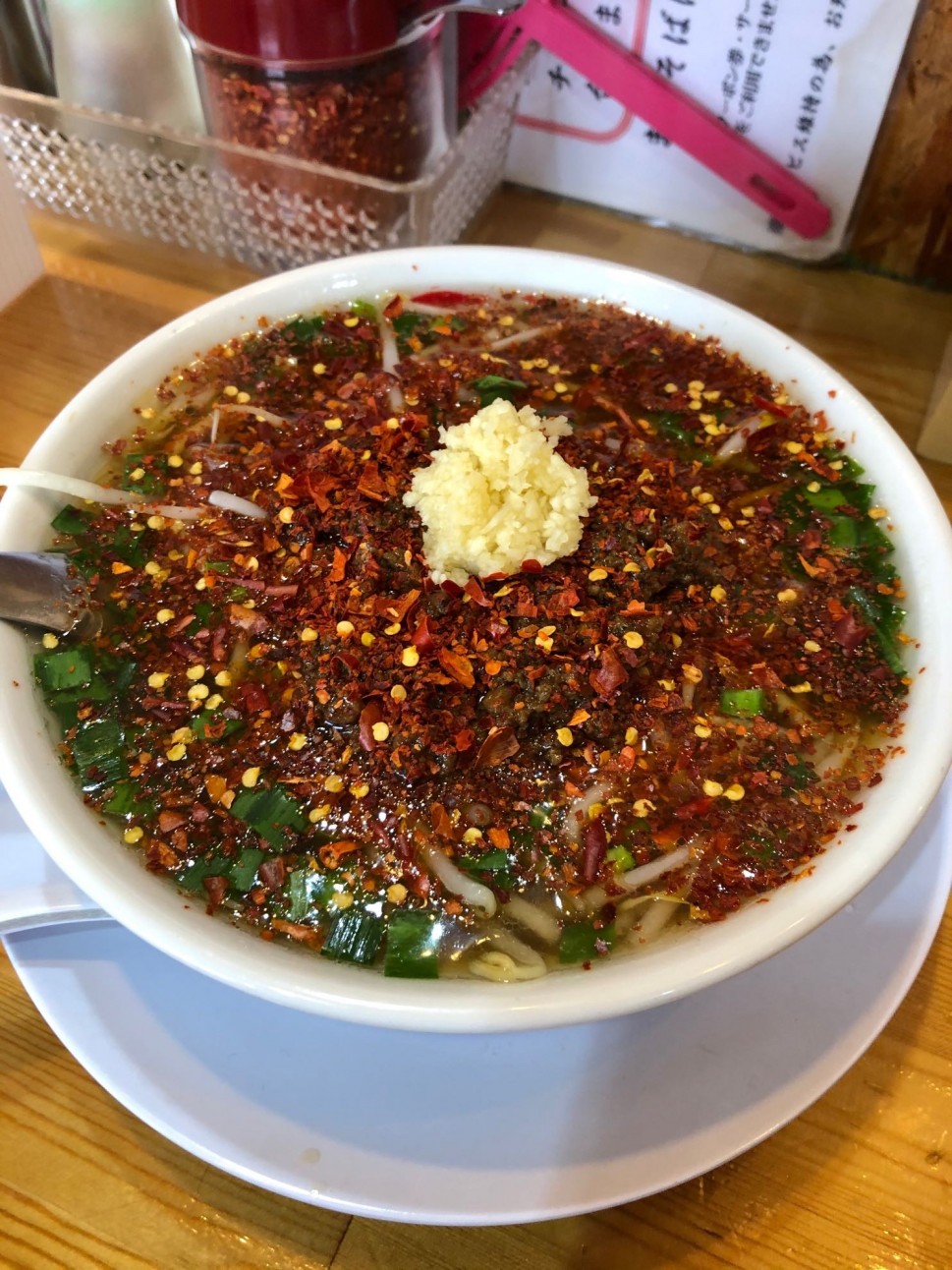 辛いラーメン屋さんじゃないので自分で卓上の荒引き唐辛子を投入してピリ辛使用に♬