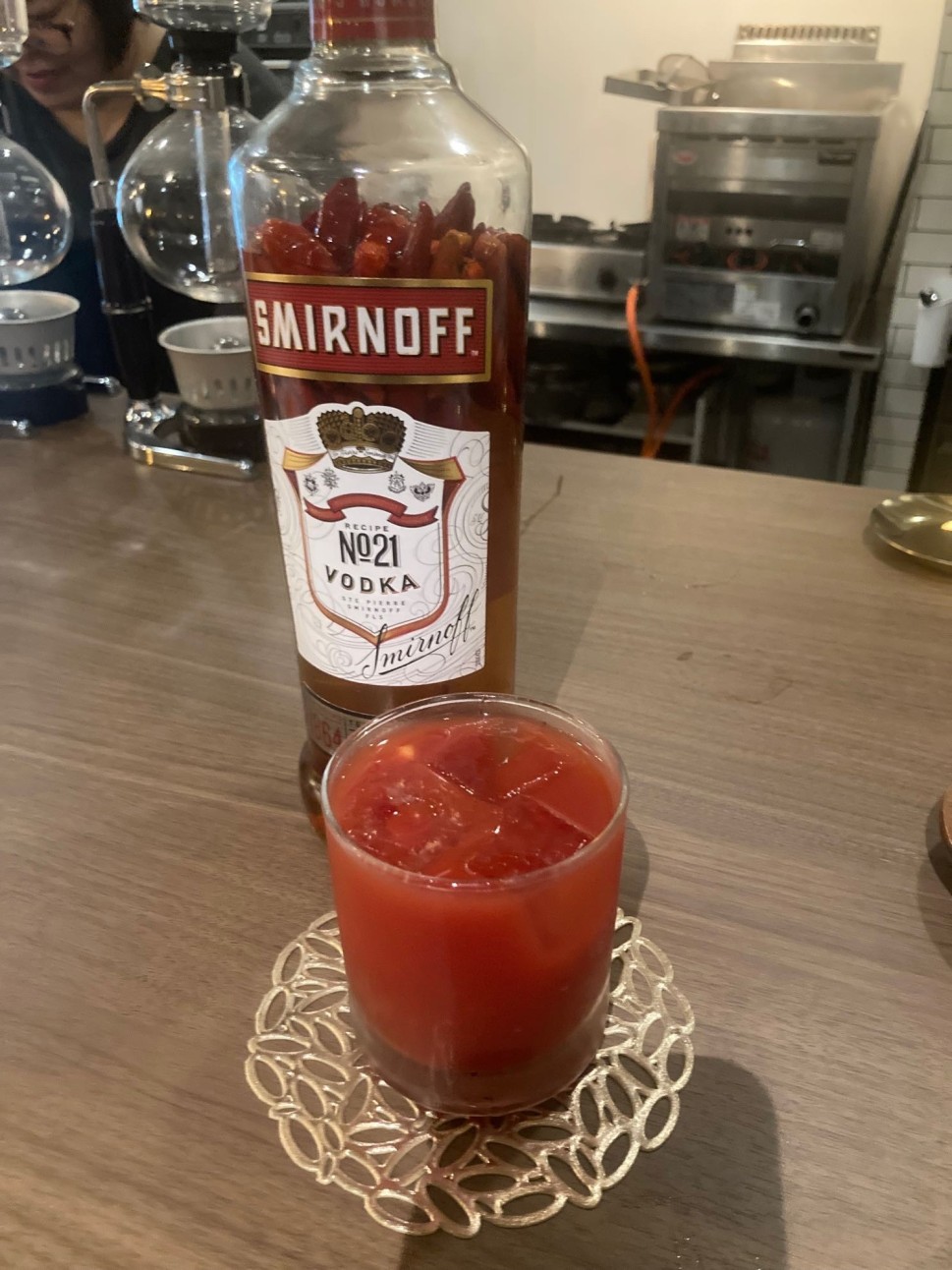 唐辛子をたっぷり漬けたウォッカが入っており、しっかり辛さを感じます。