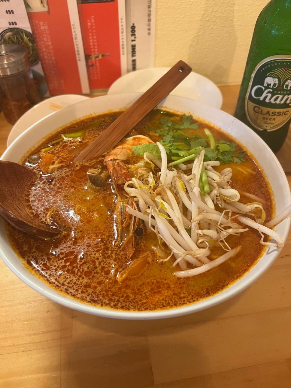 珍しい飲料がたくさんあり、その中でチャーンビール、パクチーレモンサワーをヌードルに合わせて頂きました。