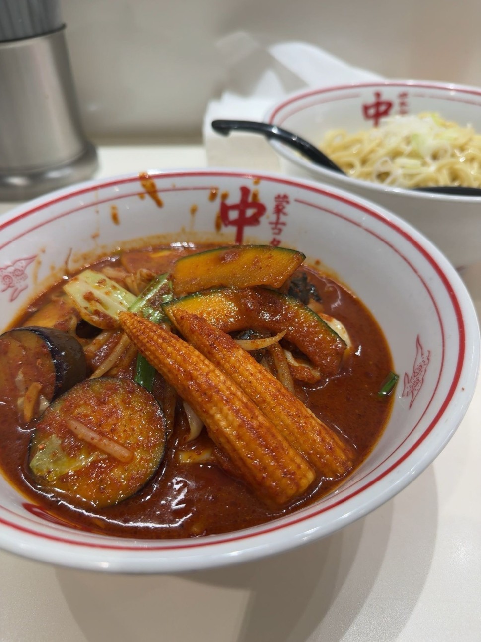 秋の限定です。定番の冷やし味噌やさいにコーン、ナス、カボチャが加わって、とてもまろやかで食べ易いですよ。野菜増しがおすすめです。