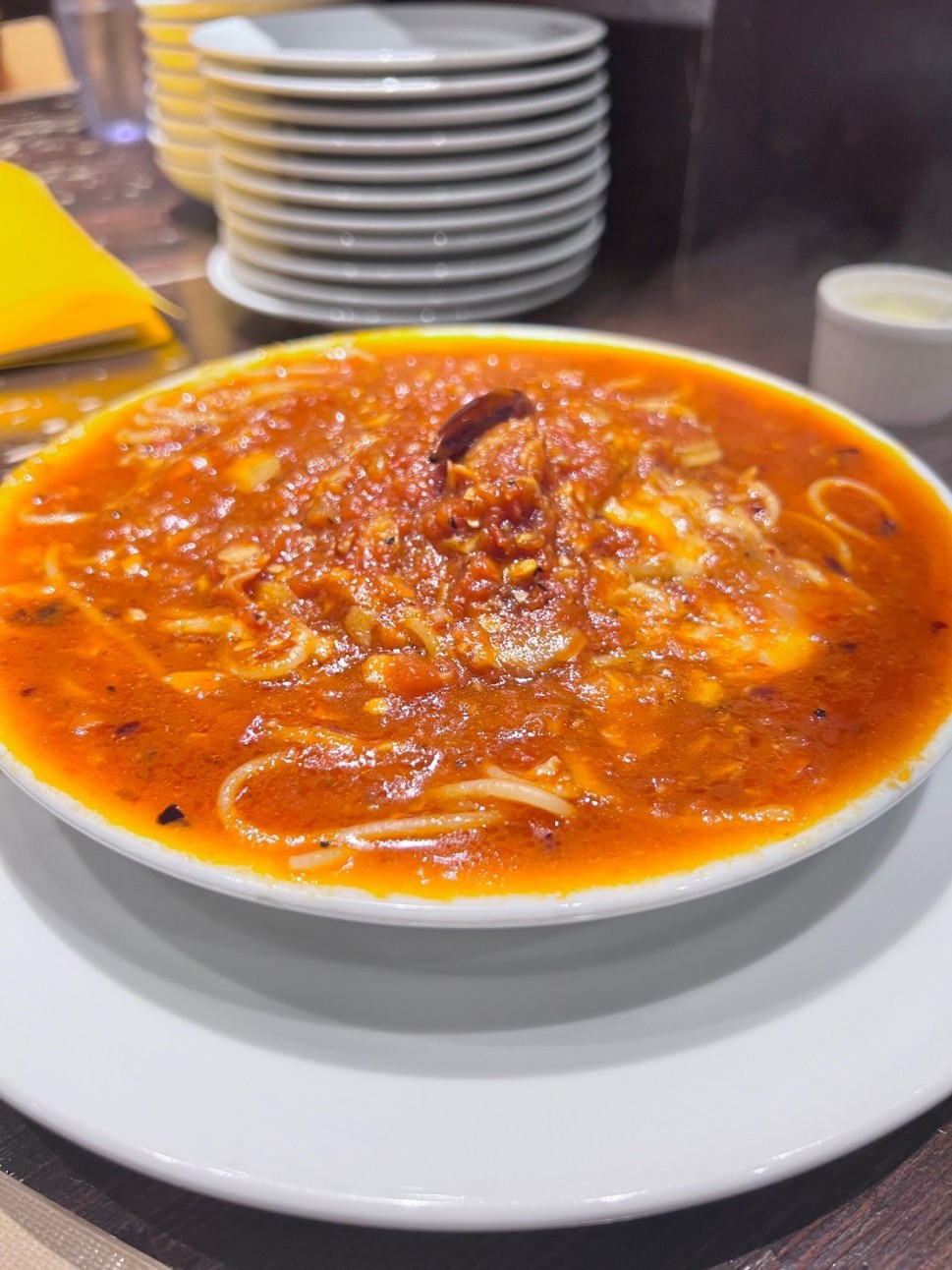 見た目は辛そうだけど、これはトマト!唐辛子も入ってますが。にんにくが効いてて、溢れそうなスープ、独特な味で、病みつき感あり。