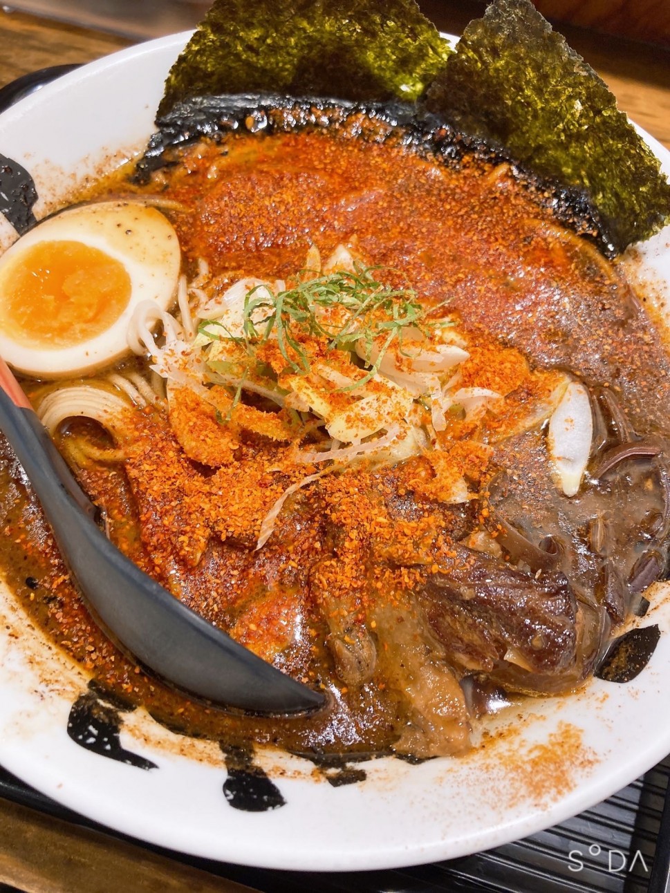 完食を諦めかけるほどのハバネロの強い辛さがある。しかし濃厚豚骨スープ本来の旨み、チャーシューや麺などのラーメンとしてのクオリティは高い。今度は普通の赤ラーメンでいいかも。