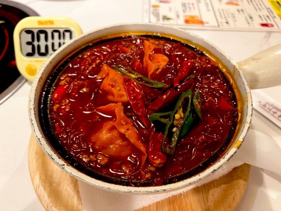 スープの辛さが上のせいか、トッピングの满天星唐辛子レッド水餃子は、普通の水餃子のごとく、ふわふわでほろほろ。
