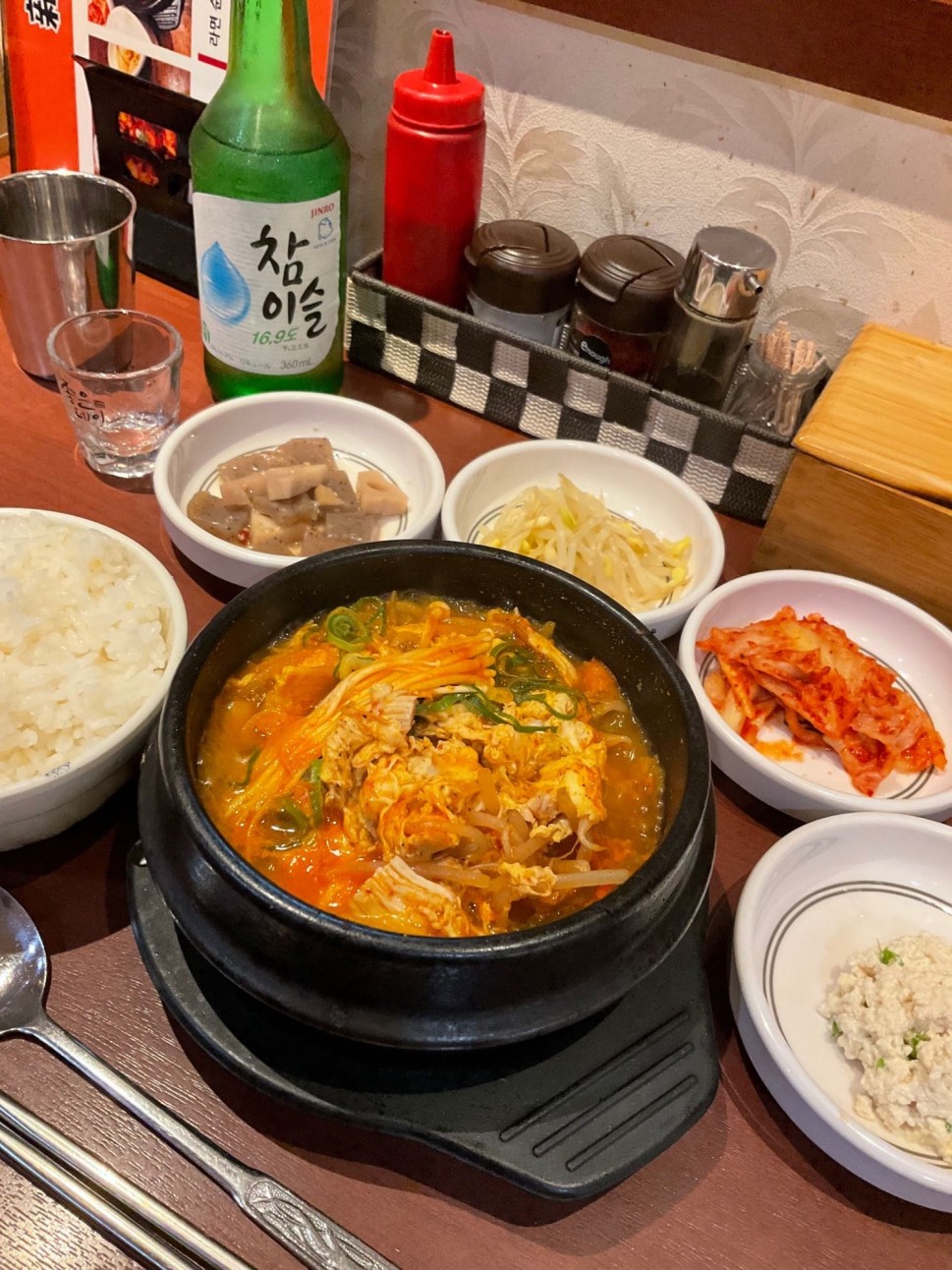 さっぱりとした、鶏胸肉とたまごを使った唐辛子スープの定食セットです。小鉢4種とご飯が付き、ボリュームがあってコスパもいいお店です。