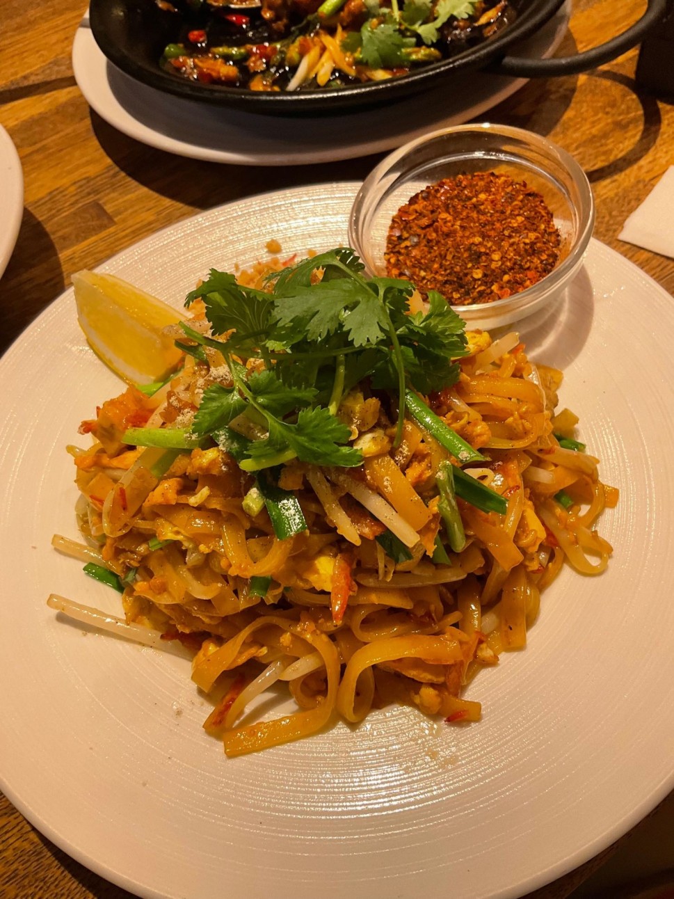 干しエビの香ばしさとナッツの口当たり、甘酢ぱっぱいソースで安心できる美味しさです。パッタイは辛くはありません。