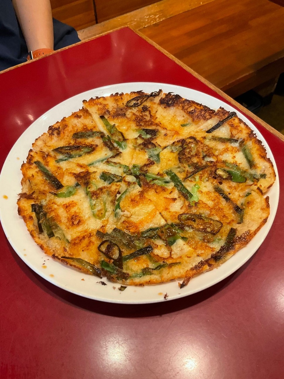 通い初めのお店でたまに言うんです。『このお店で一番辛いものを下さい』第3位がこちらの青唐辛子のチヂミ。種や綿をとってあるのでしょう、スッキリした辛さとふわっトロの生地でいくらでも頂けそうでした。