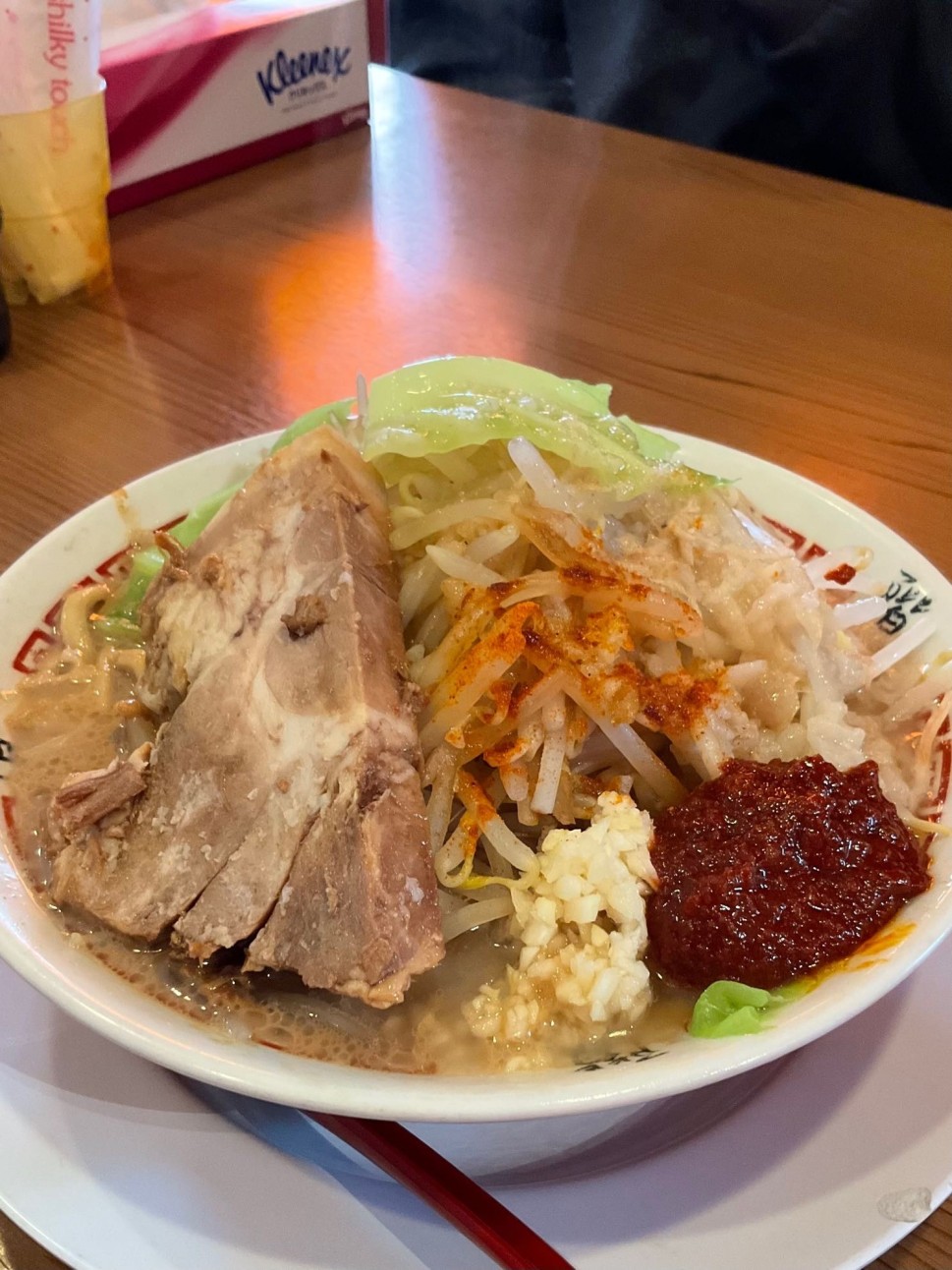 こちらのお店のスープが個人的どストライク。甘いのと旨いのと濃いのが絶妙にマッチ、大好きな極太麺がもちもちして至極の一杯でした🤗。辛さはタイトルほどのインパクトは無く、辛いと言えば辛いかなぁぐらい。トッピング3倍ぐらい入れたら、私好みのKM値になるかな?