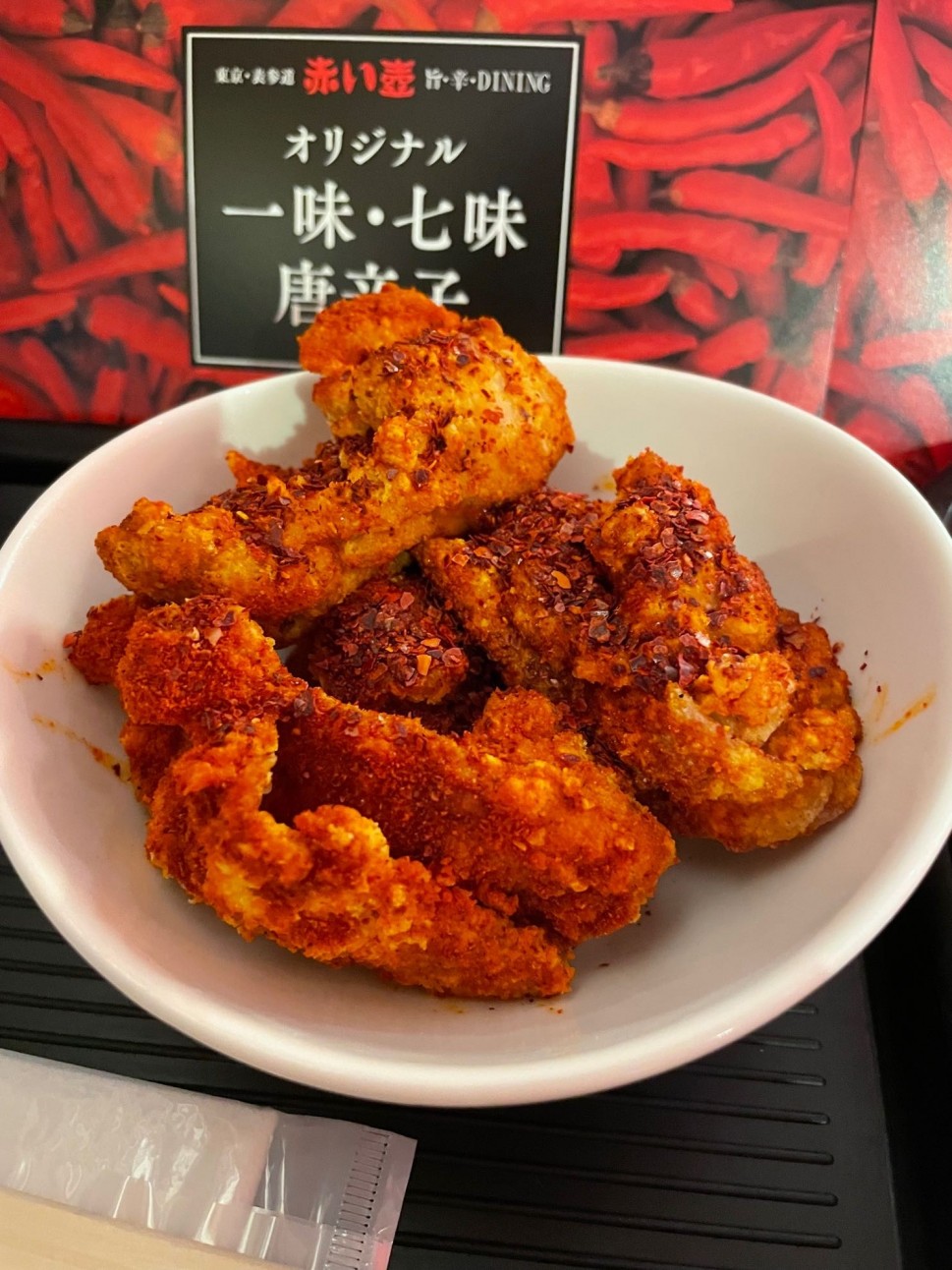 赤い壺さんとらんまん食堂さんのコラボメニューです!辛さレベルは5辛だと記載されていました。ジューシーな唐揚げでとても柔らかく、美味しかったです!粉末唐辛子がたっぷりかかってますが辛味はほぼ感じられませんでした。