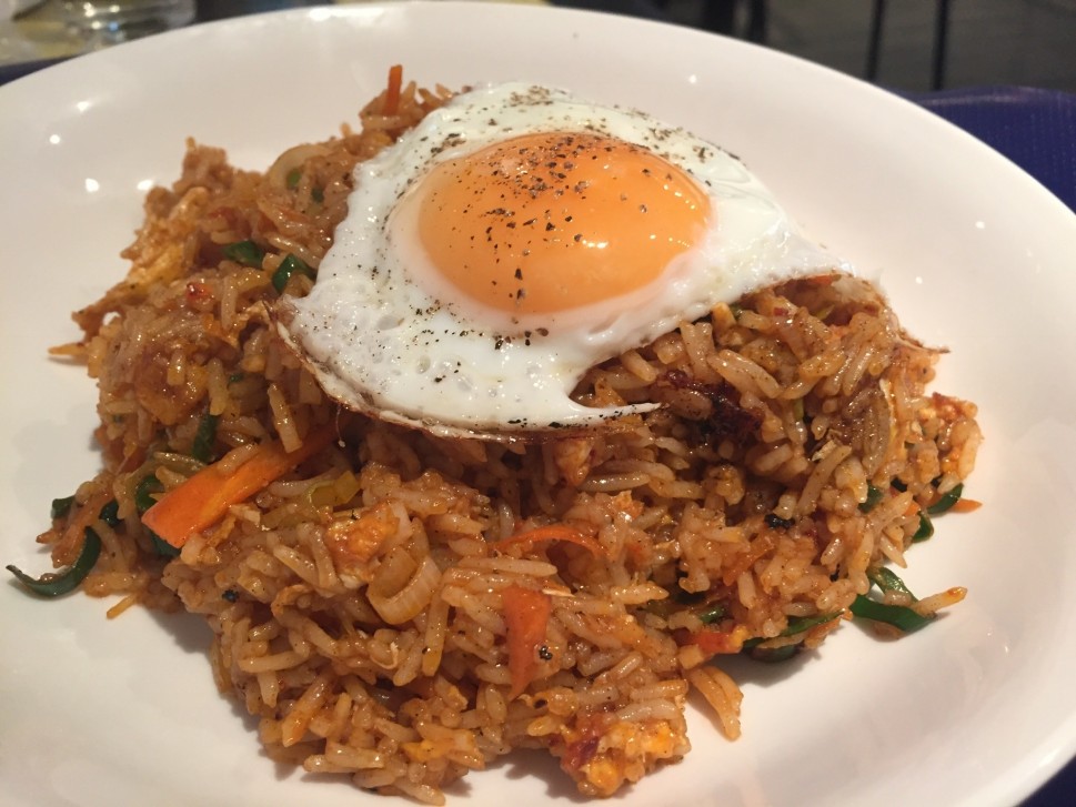 スリランカの最上級の米を使った炒飯は、香りもよく旨辛。そこにスパイス効いたチキンカレーを一緒に食べるマリアージュはこの店ならでは。