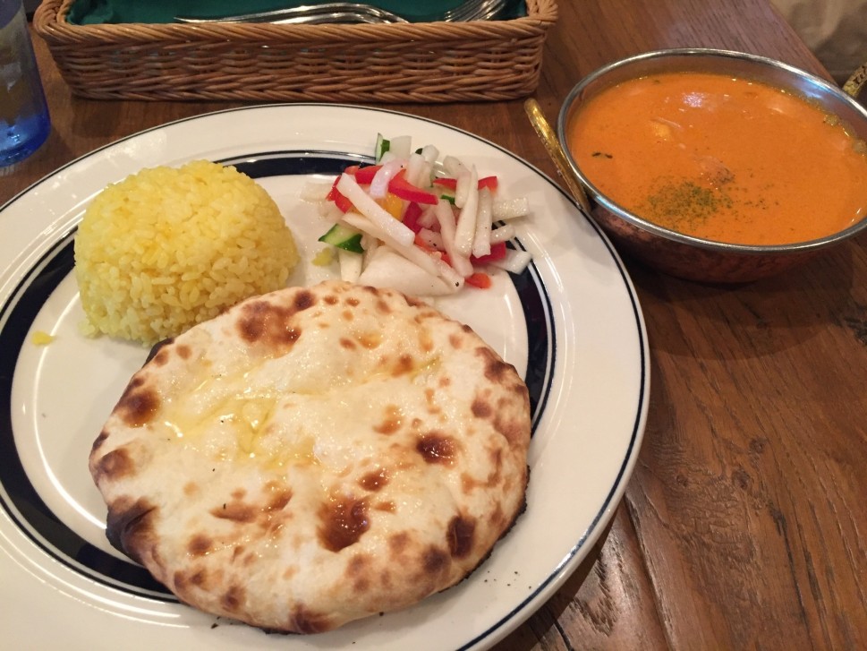 銀座一丁目のビルの地下。陽の光も差し込み、店が良い雰囲気なんですよね〜。チーズクルチャは味が濃厚。バターチキンと合わせて旨辛。
